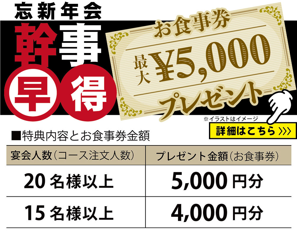 【対象コース】当ページに掲載の5,000円(税抜)以上の宴会コース