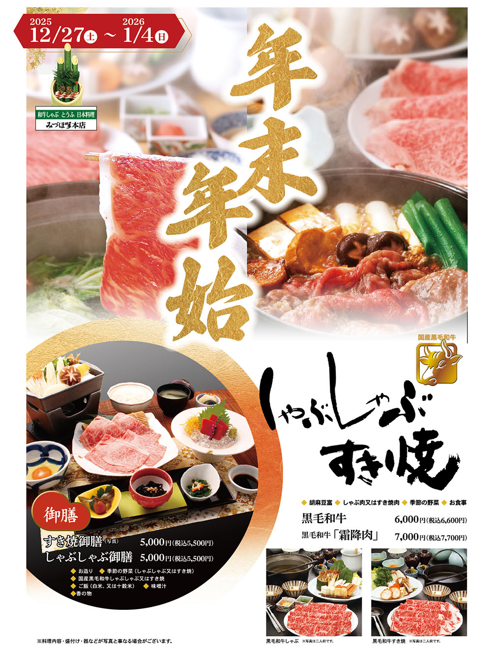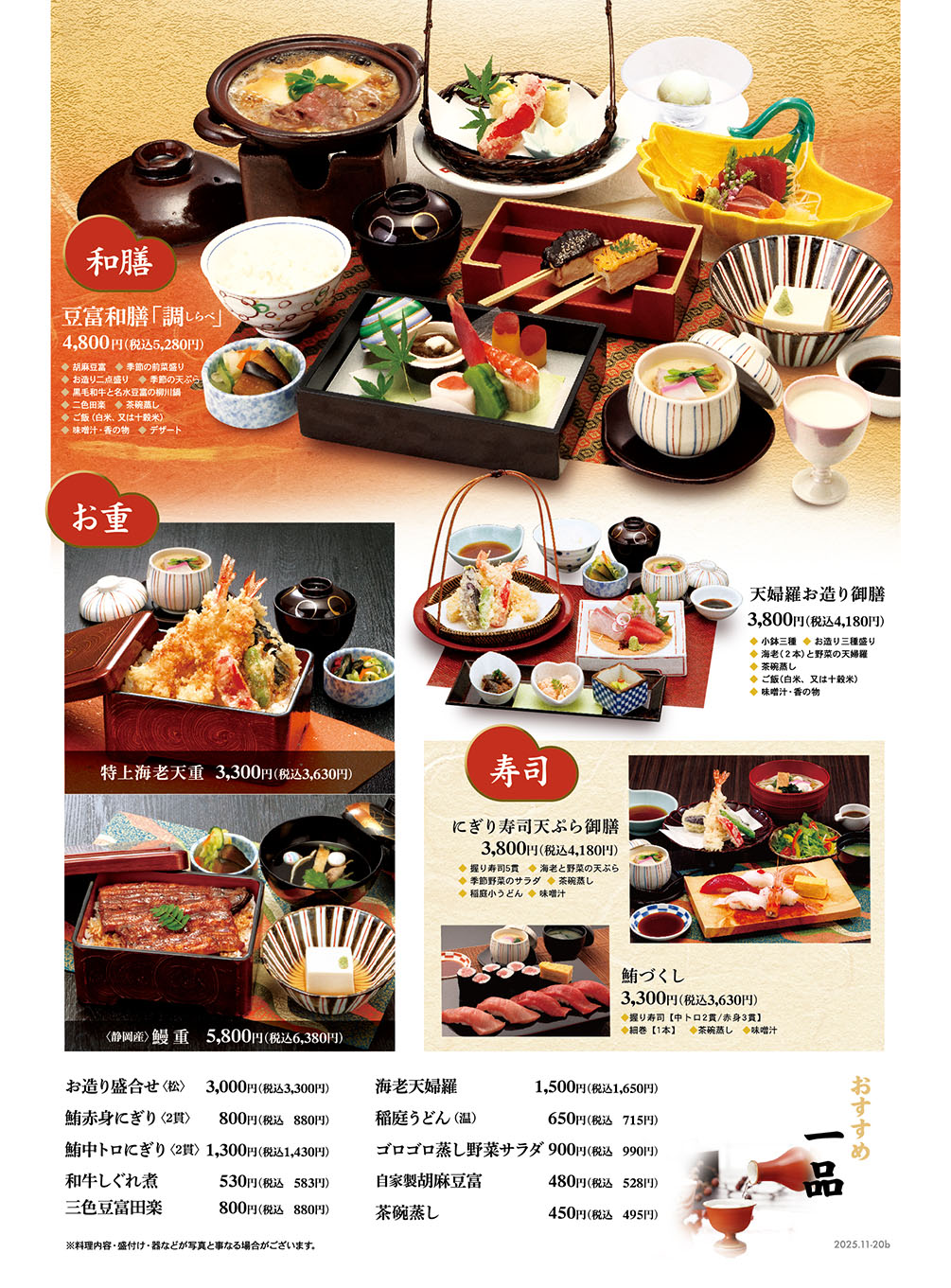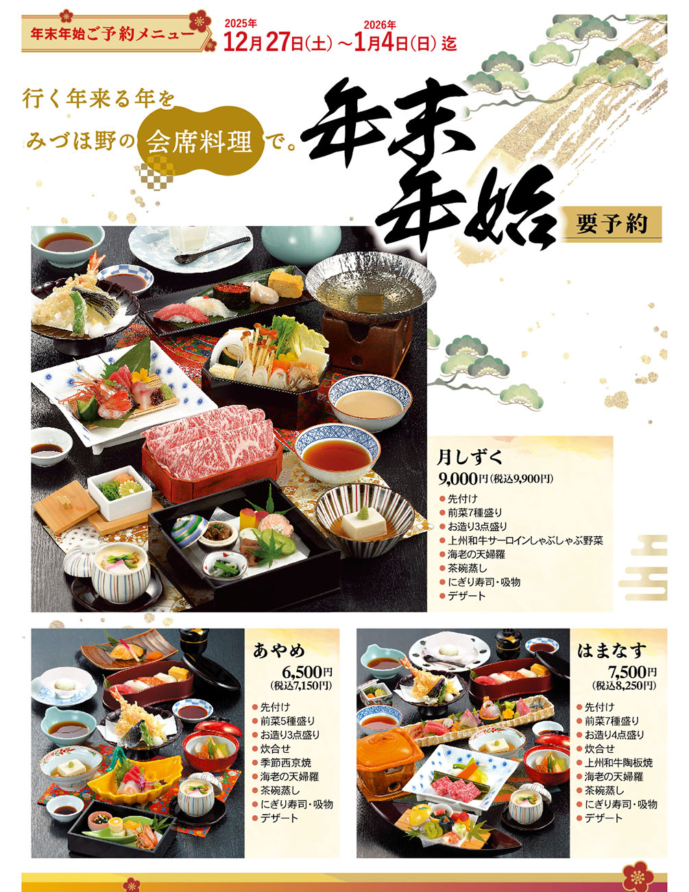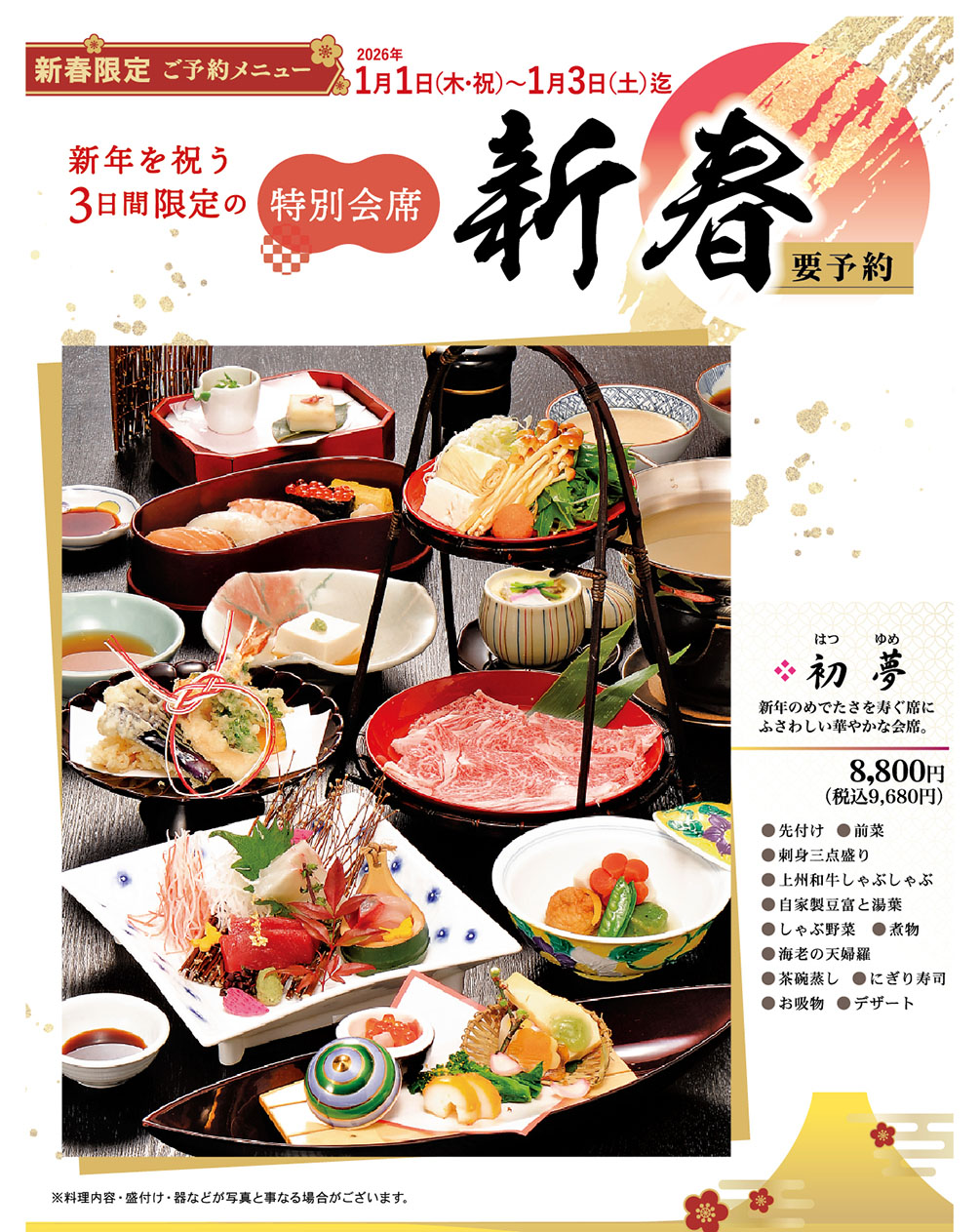 特別会席&会席料理のご案内 三が日限定の特別会席「初夢」のほか、年末年始を彩る予約限定の会席料理をご紹介。 ※特別会席・会席料理はご予約のみ承ります 〜予約不要・店内メニュー 〜 2025年12月27日(土)〜2026年1月4日(日) 年末年始限定 特別メニュー オンライン予約はこちら>>> ※予約日の3日前までにご予約ください。直近のご予約はお電話にて承ります。 電話予約はこちら>>> TOPページに戻る>>>