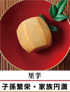 種芋から多くの子芋・孫芋が付くことから、子孫繁栄の意。丸い形は家族円満を表す。