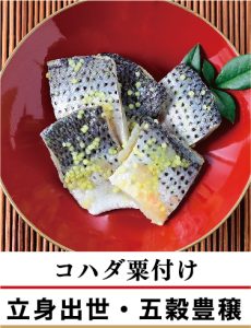 コハダは出世魚なので縁起がよいとされている。粟漬けの黄色は五穀豊穣を願うもの。