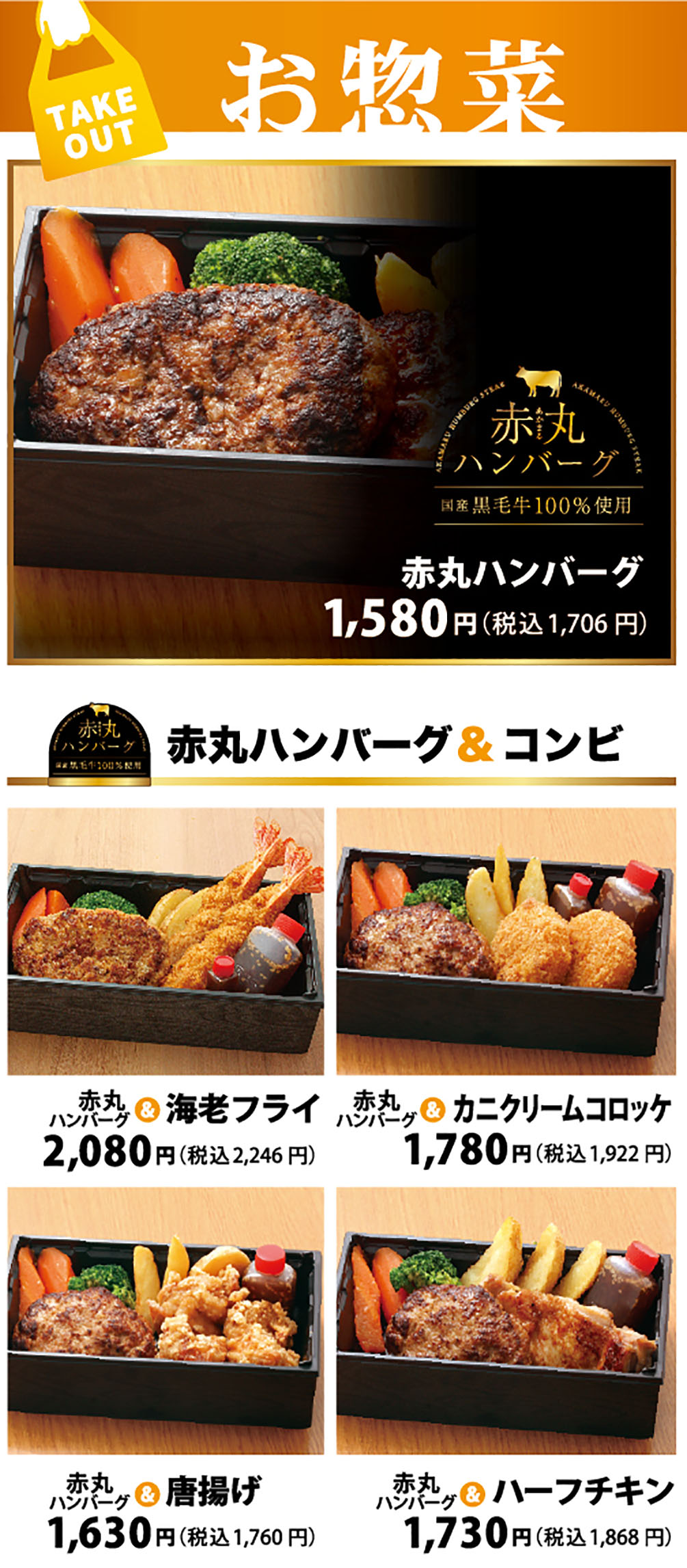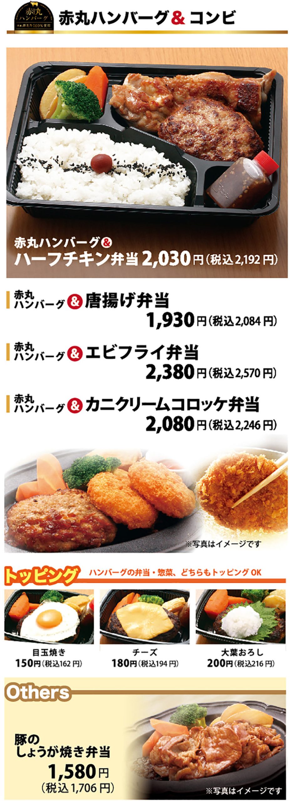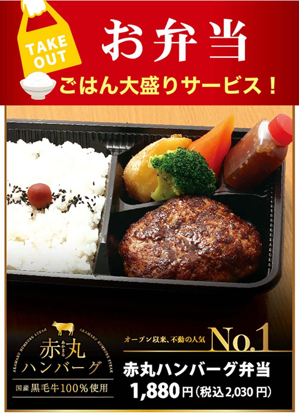 当店人気No.1の赤丸ハンバーグをご自宅でも! お弁当だけでなくお惣菜としても販売しております。